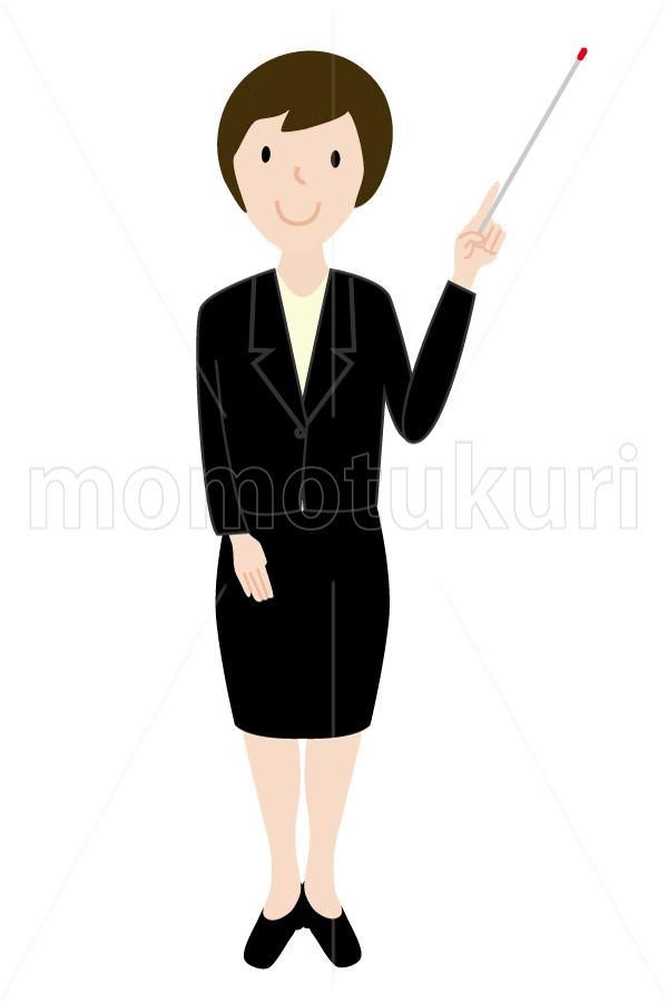 スーツ姿の女性のイラスト。 ポイント チェック 注目 指し示す ! などを表しています。説明する様子。